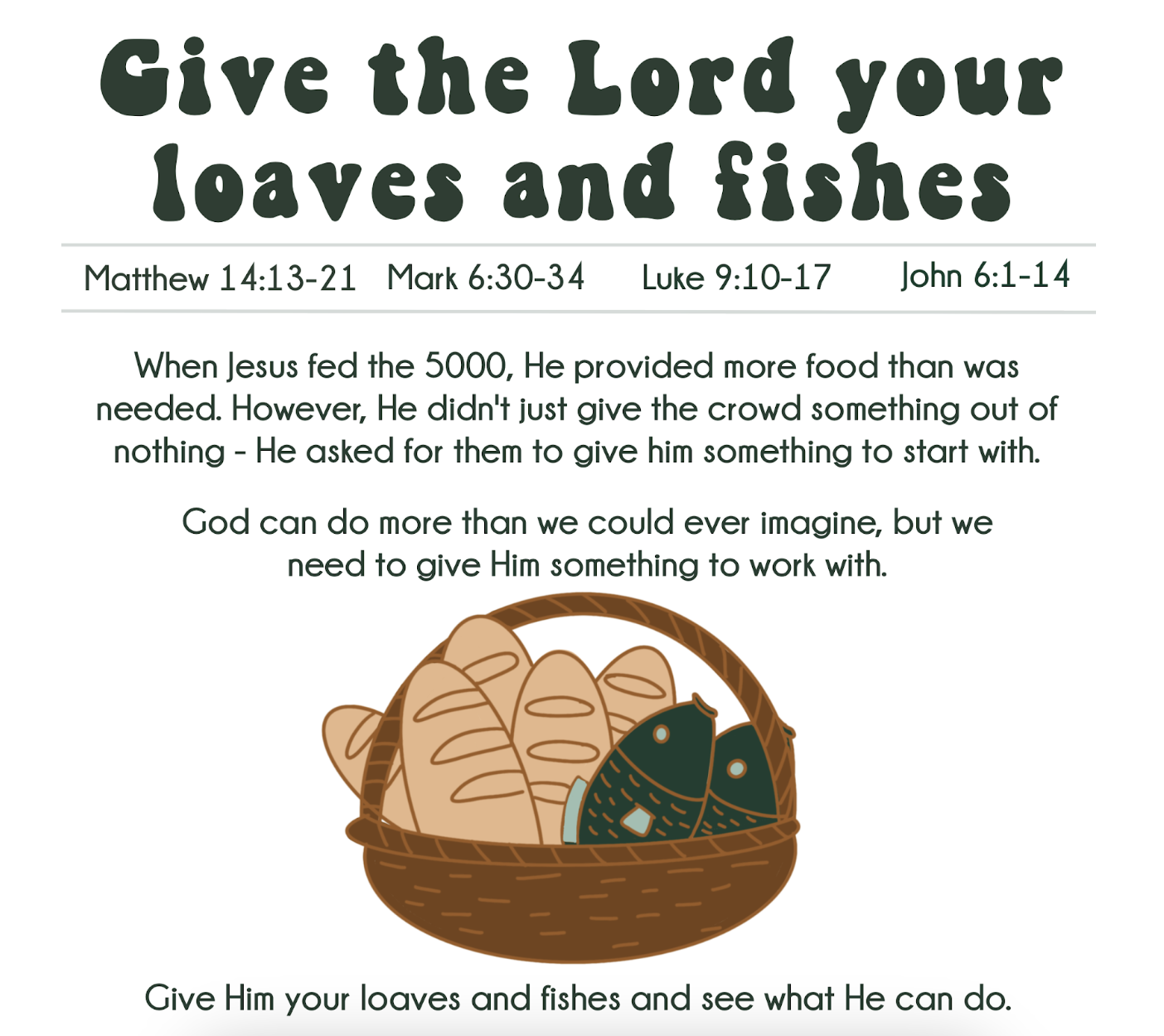 Here is a printable version of the graphic below to print and insert it into your Bible or hang it on your wall to remember that God can (and will!) use you if you’ll just give Him your loaves and fishes.